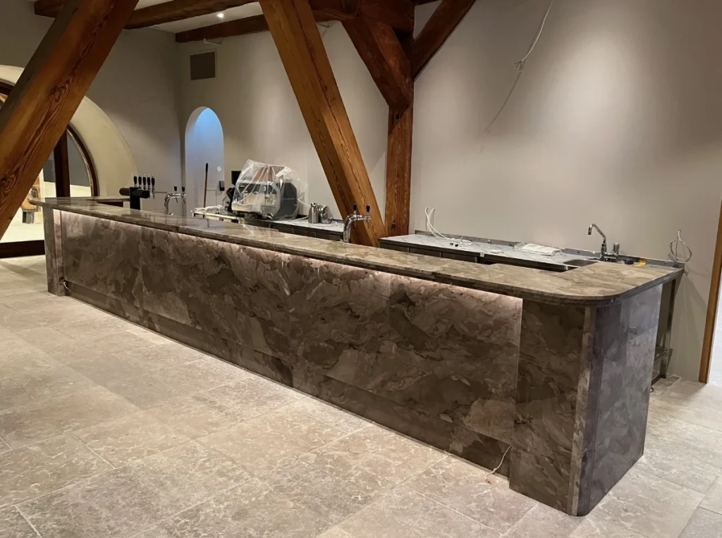 Efter att vi tagit måtten, beställer vi stenskivorna från våra samarbetspartner – ledande stenhuggerier och leverantörer av rostfritt stål.